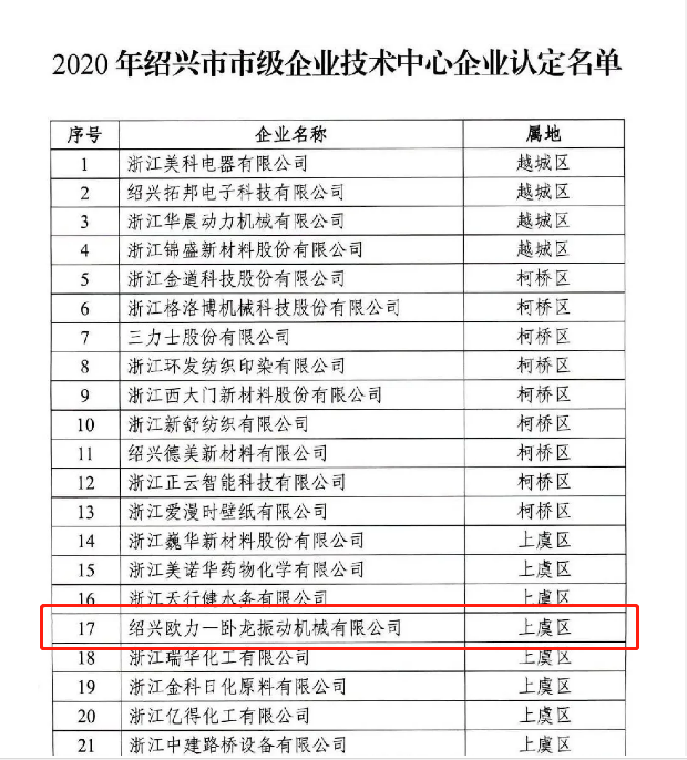 近日,紹興市經(jīng)信局公布了2020 年紹興市市級(jí)企業(yè)技術(shù)中心認(rèn)定名單,歐力-臥龍等45家企業(yè)技術(shù)中心入選。